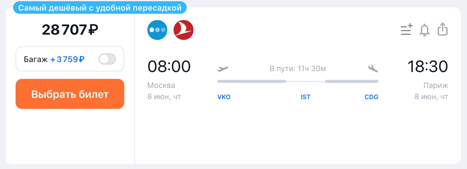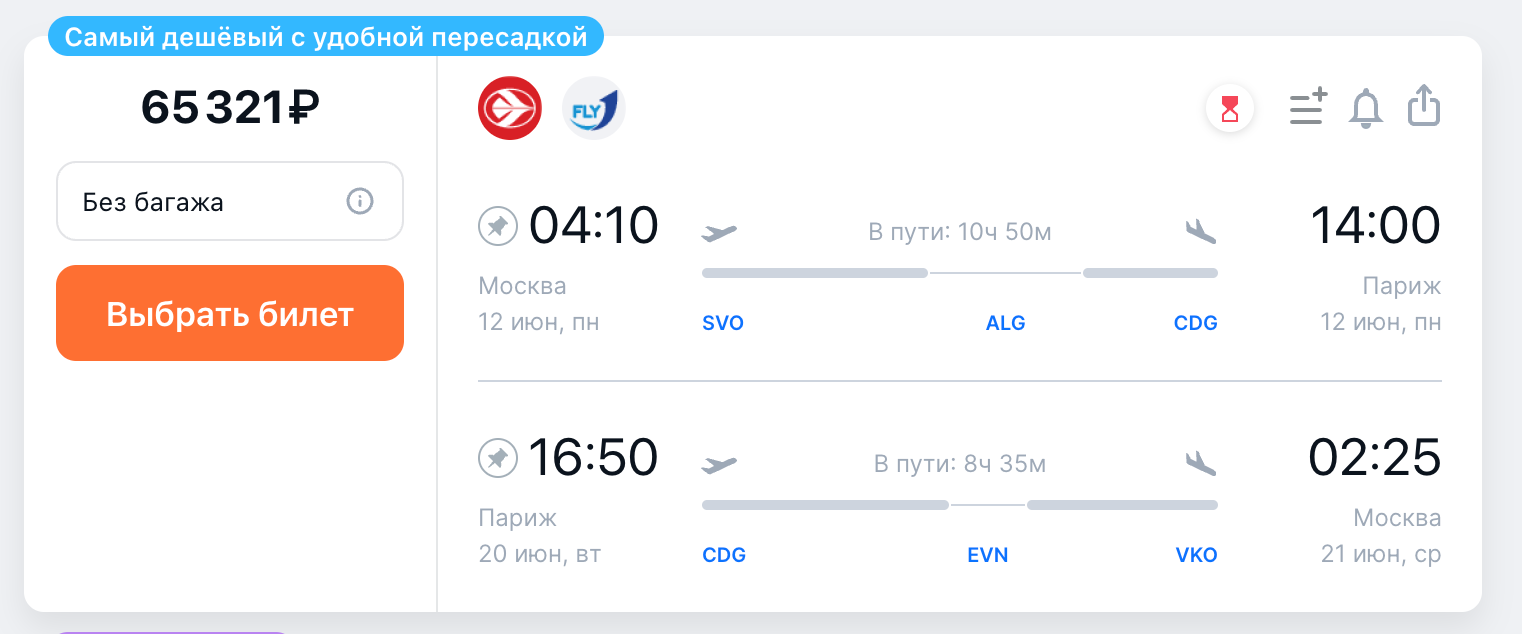 Для примера, вариант бронирования из Москвы в Париж одним запросом дороже почти на 5 000 рублей, чем вариант с двумя отдельными запросами.