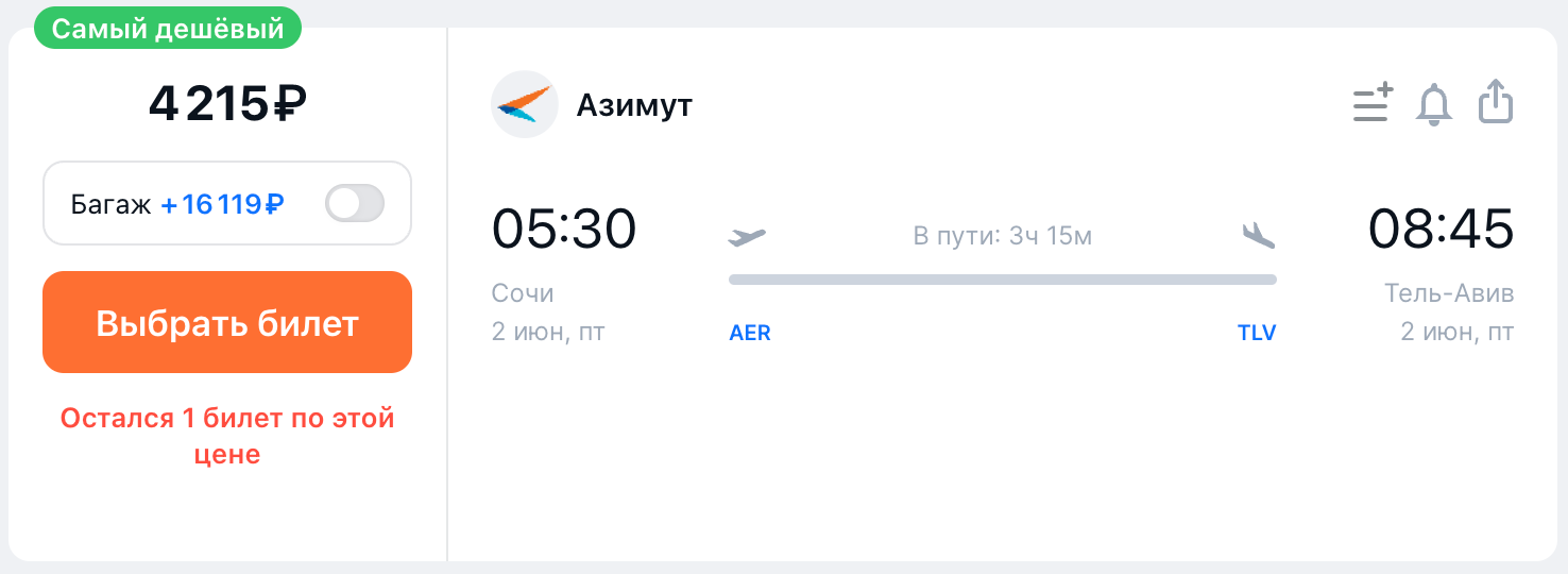 Например, прямой Авиабилет Москва—Тель-Авив стоит 41 300 рублей. Лететь — восемь часов.