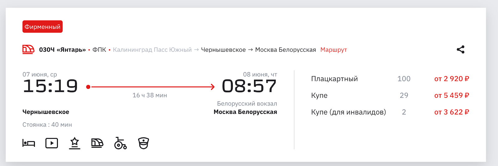 Важно купить билеты на этот поезд от станции Чернышевское в Калининградской области. Остановки в Литве технические и купить билет с отправлением оттуда не получится.