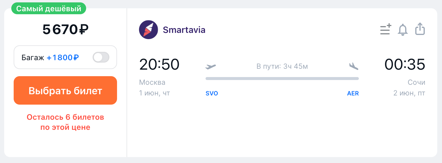 Билеты с пересадкой в Сочи на те же даты стоят 9885 рублей. Но время в пути увеличится до 12 часов.
